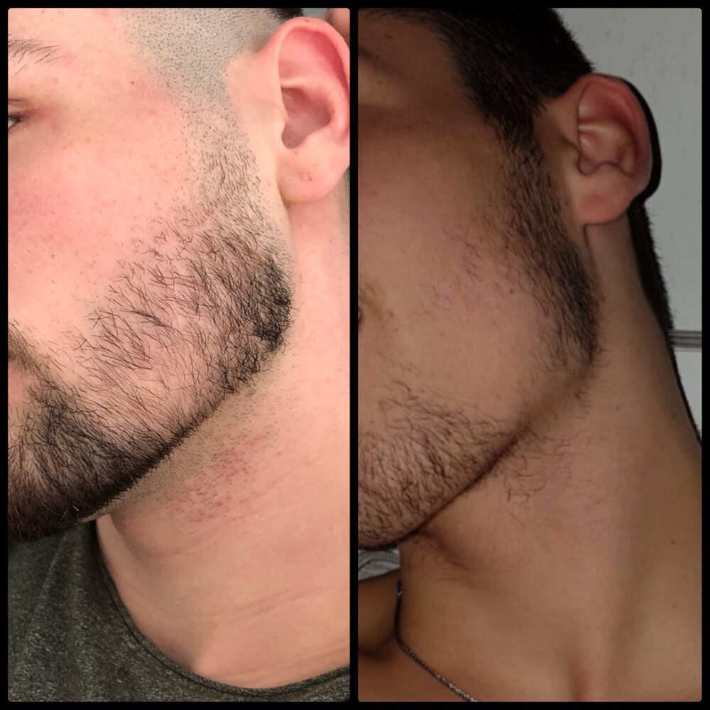 Редкая борода вдоль линии щёк: после двух месяцев появились тонкие волоски, после четырёх — зона стала плотной, контур подчёркнут.