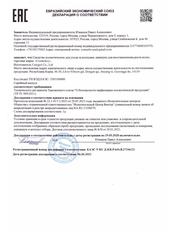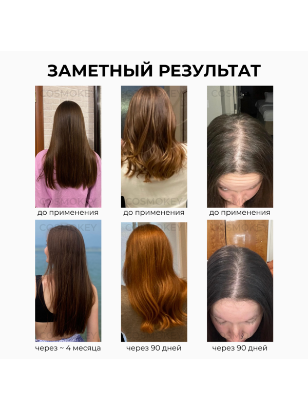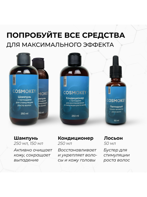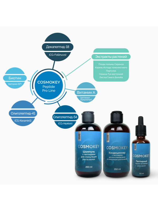 Максимальный эффект восстановления и ускорения роста волос достигается при применении совместно с Кондиционером Cosmokey и Лосьоном-активатором роста волос Cosmokey. Зарубежные исследования подтвердили, что регулярное применение препаратов на основе пептидного комплекса дает видимые положительные результаты через 60 дней: