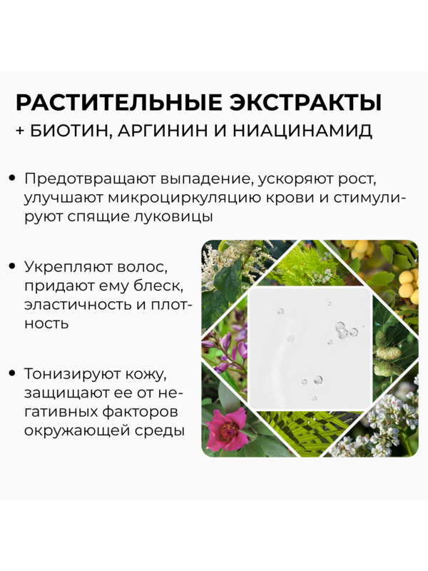 • биотин — улучшает питание кожи головы, увлажняет, уменьшает ломкость стержня, стимулирует рост, нормализует работу сальных желез;
