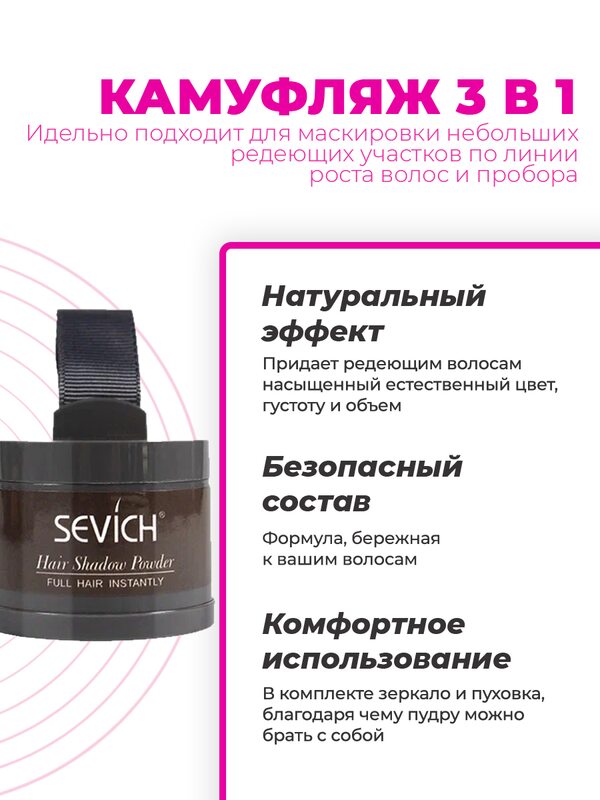 Пудра-загуститель в компактной упаковке 3 в 1: средство для камуфляжа, зеркало, пуховка. Предназначена для маскировки небольших редеющих участков по линии роста волос и пробора.