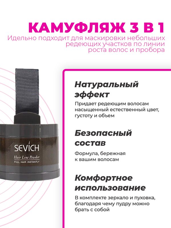 Пудра-загуститель в компактной упаковке 3 в 1: средство для камуфляжа, зеркало, пуховка. Предназначена для маскировки небольших редеющих участков по линии роста волос и пробора.